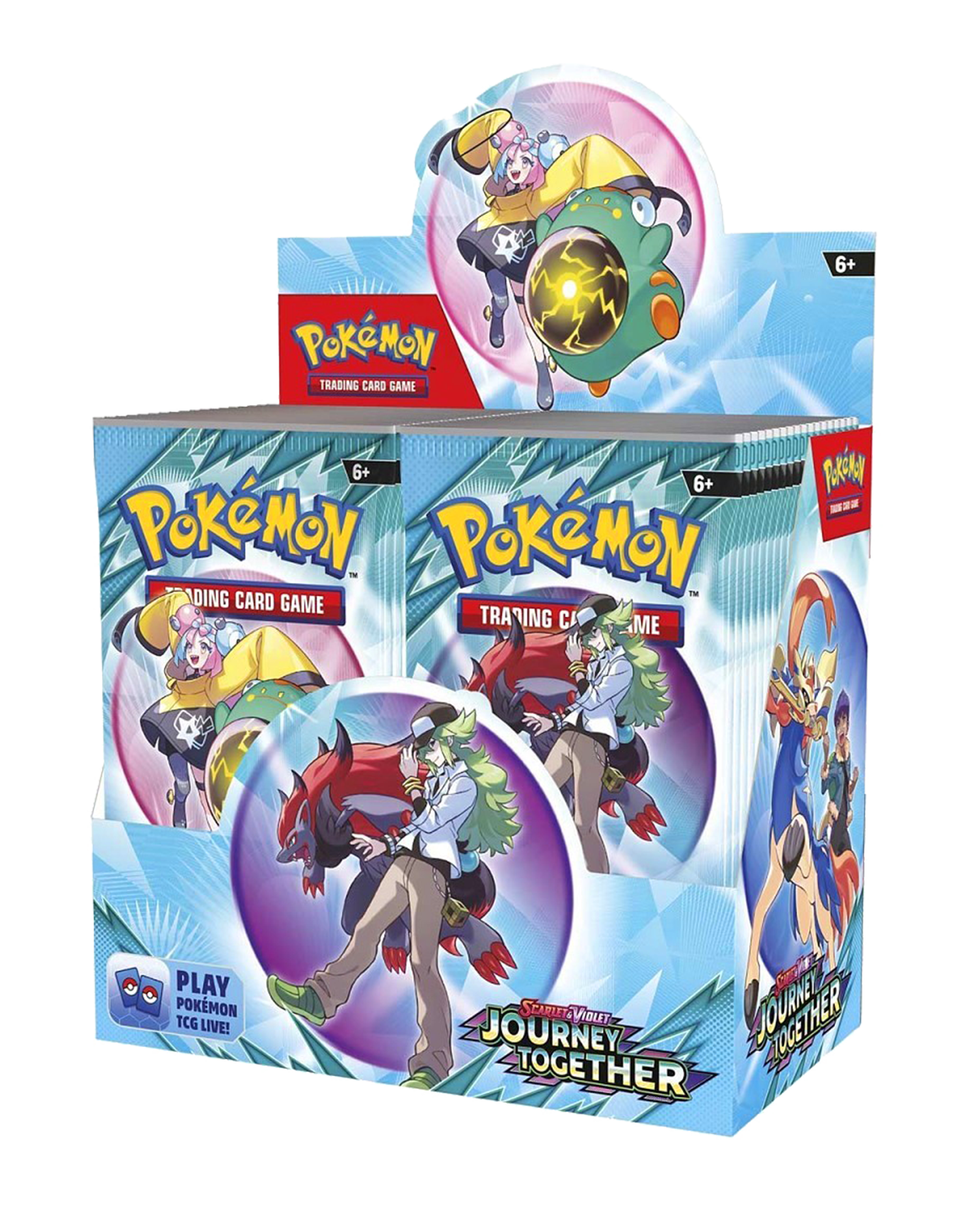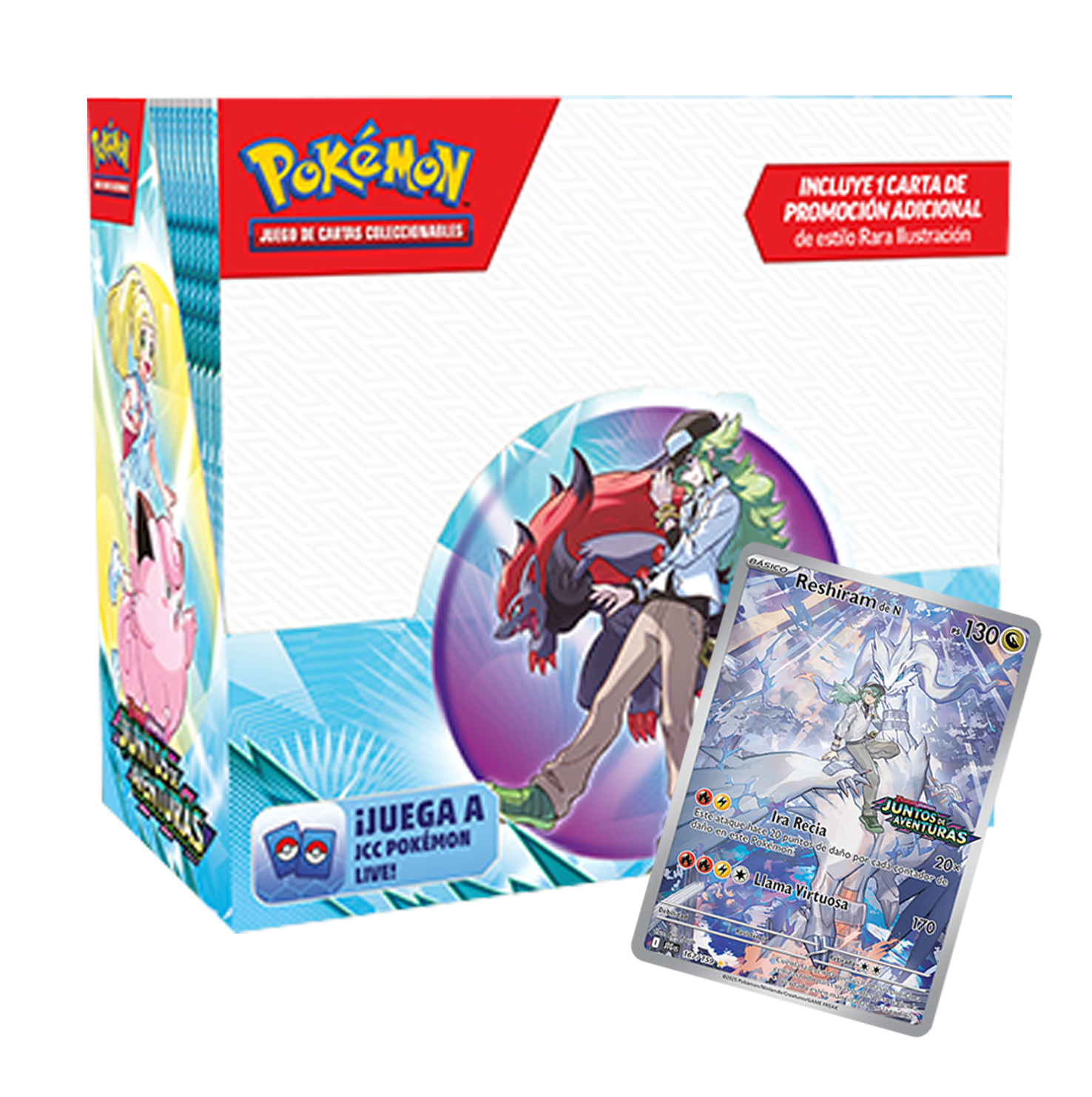 Caja ESPECIAL de 36 Sobres de refuerzo de la expansión - Escarlata y Púrpura - Juntos de Aventuras - de Pokémon TCG en Español que incluye la carta promocional de Reshiram de N con logo.